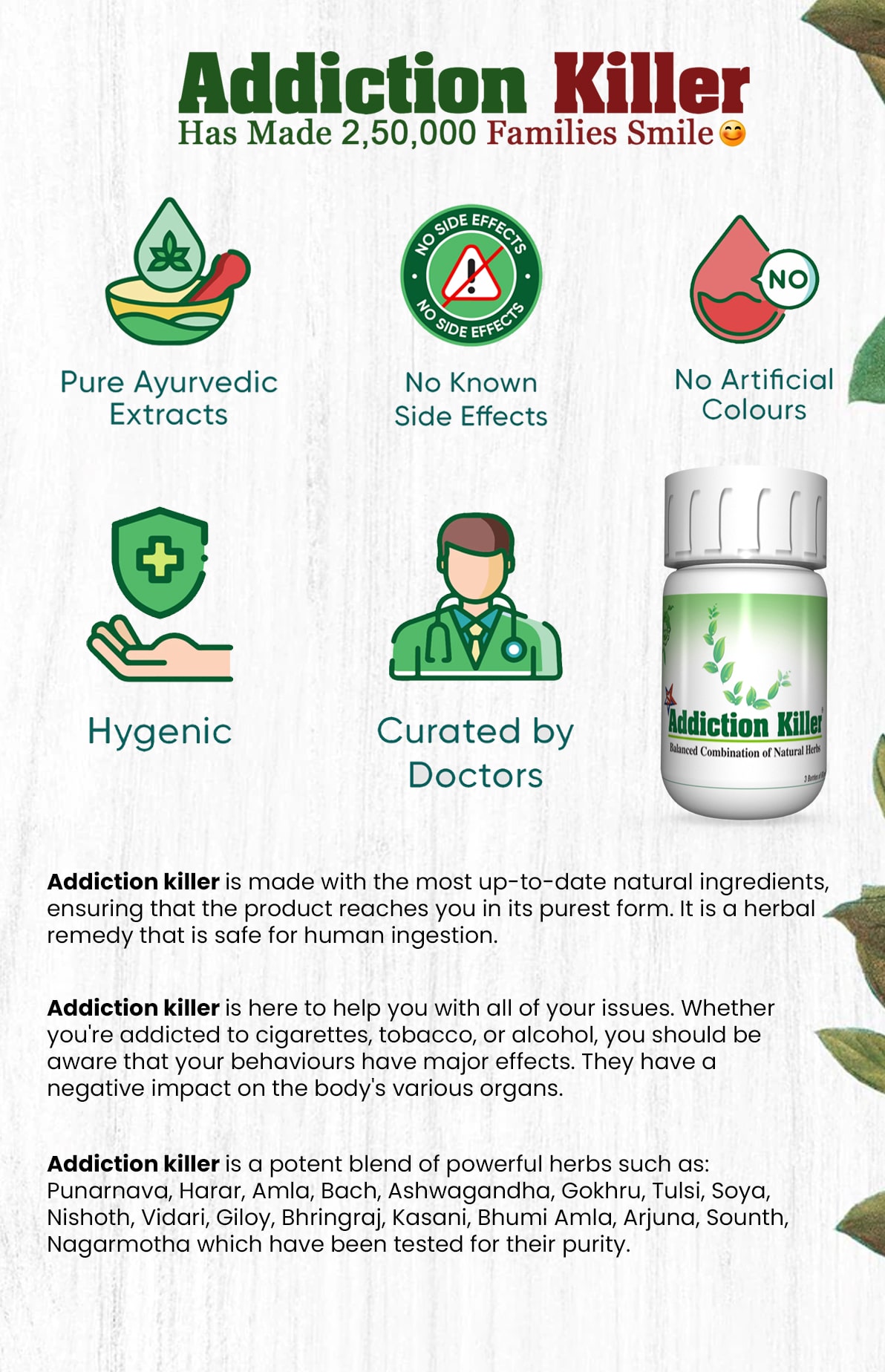 Addiction Killer is an ayurvedic treatment that naturally combats addiction's causes and frees people from their addiction captivity.